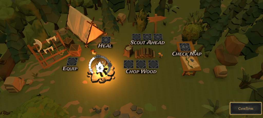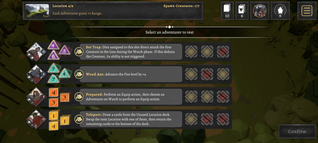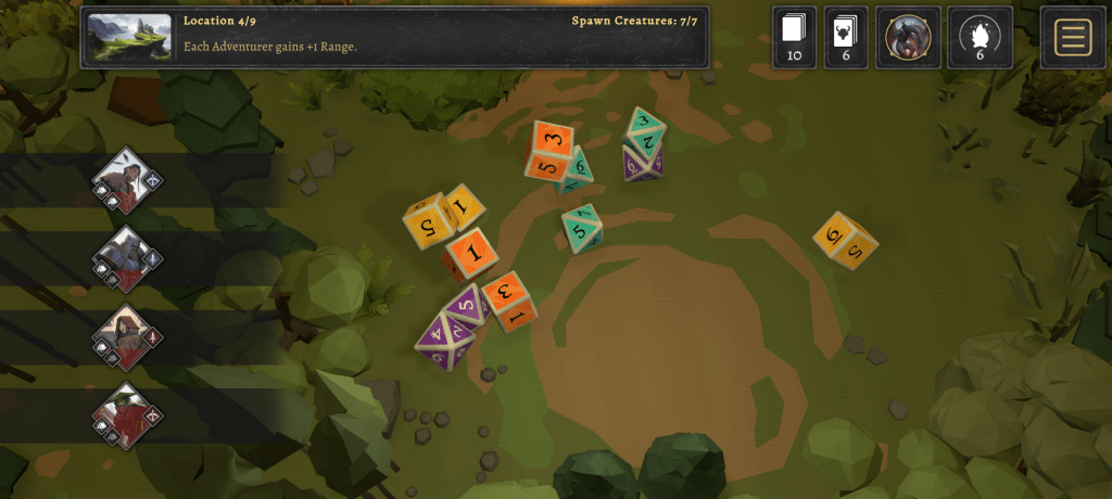 The game automatically saves your progress as you play through a short 9 location campaign. Each location adds a little extra challenge or a bit of a respite depending on what you draw. It’s a nice way to step away from the game if something comes up and you need to stop playing. Since it’s digital, there’s nothing to clutter your table and you don’t need to be wary of moving pieces around by accident.