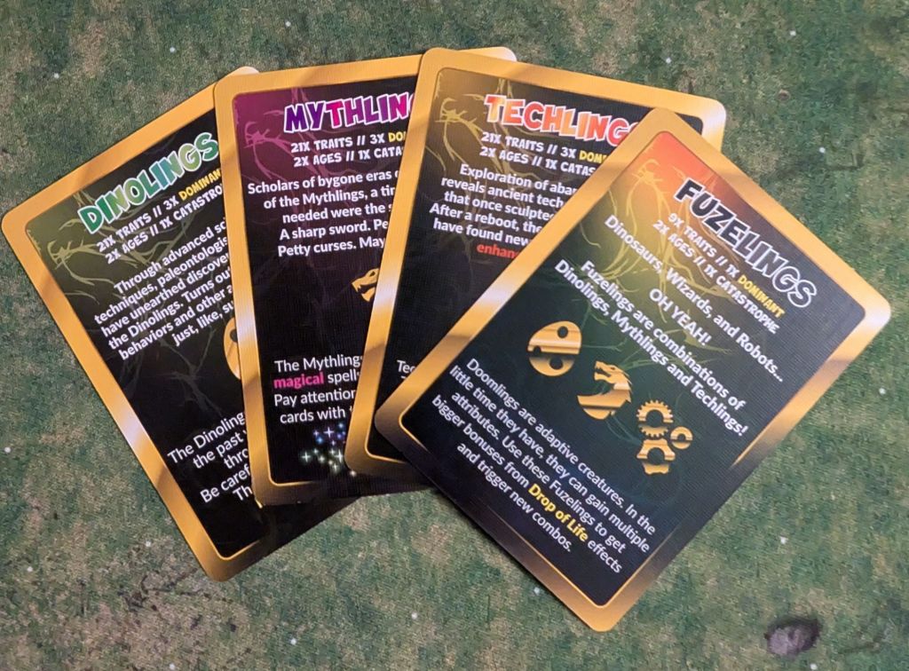 What was surprising about this title: It was surprising how many different types of cards are included in this expansion. You don’t have to worry about keeping track of what is what though, because the cards are self explanatory with clear symbolism and listed actions. This allows you to enjoy the game without it feeling cumbersome with all the new additions. However as you play you’ll intuitively get the sense of what type of Doomlings you want to gravitate to the most for your strategy. Attachments with Techlings, sacrificing Mythlings for their discard abilities and more.