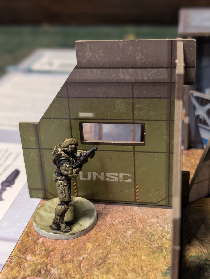 In Halo: Flashpoint Spartan Edition, you take control of a team of Spartans or Elites (though there are also different teams available with expansions). Your team will consist of 3-4 models and you will move, hit, sprint, crouch, take cover and shoot your way to victory. Gameplay is very simple, but it takes a few turns to get into the flow. The first thing about this game that differs from Warhammer (arguably the biggest and most well known war game), is that you don’t need a tape measurer. Movement is akin to board game movement, with a gridded play mat that defines where you go and defines distance. Moving is measured in these “cubes” and your models can move a certain number of “cubes” defined by their character cards and stats. Cubes are the way in which your character can move orthogonally, diagonally, and up and down. The maps you play on are modular and can be changed in any way you and your opponent agree to before the game starts. You can climb on terrain and you do not need to have special rules on how movement works when climbing. It’s as simple as asking yourself, are there any obstacles completely blocking the path from A to B?