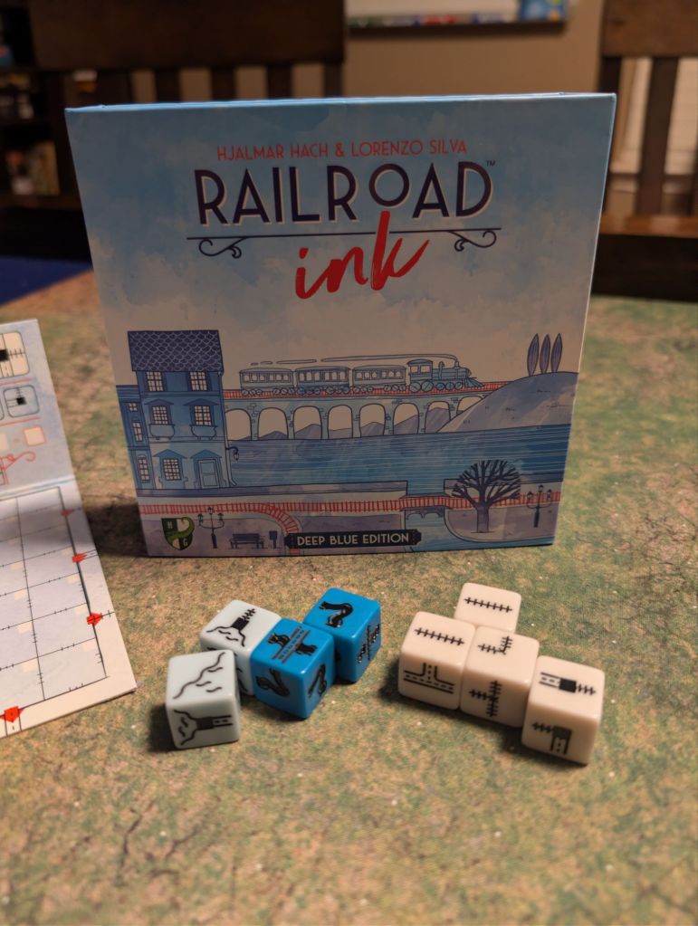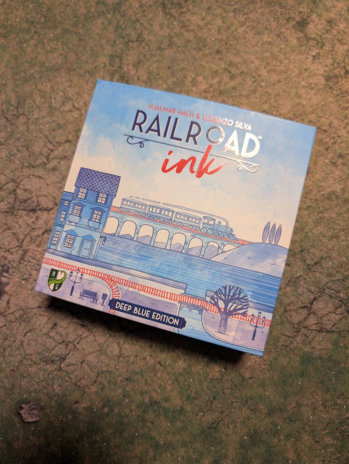 In two sentences, what do you do in the game: You play as normal Railroad Ink, over a series of rounds drawing roads and railroad tracks along the map based on four picture dice, trying to complete as many paths as possible. The deep blue edition adds two additional expansions to choose between, rivers or lakes, and you incorporate that water component through your map as much as you can to earn extra points in the game.