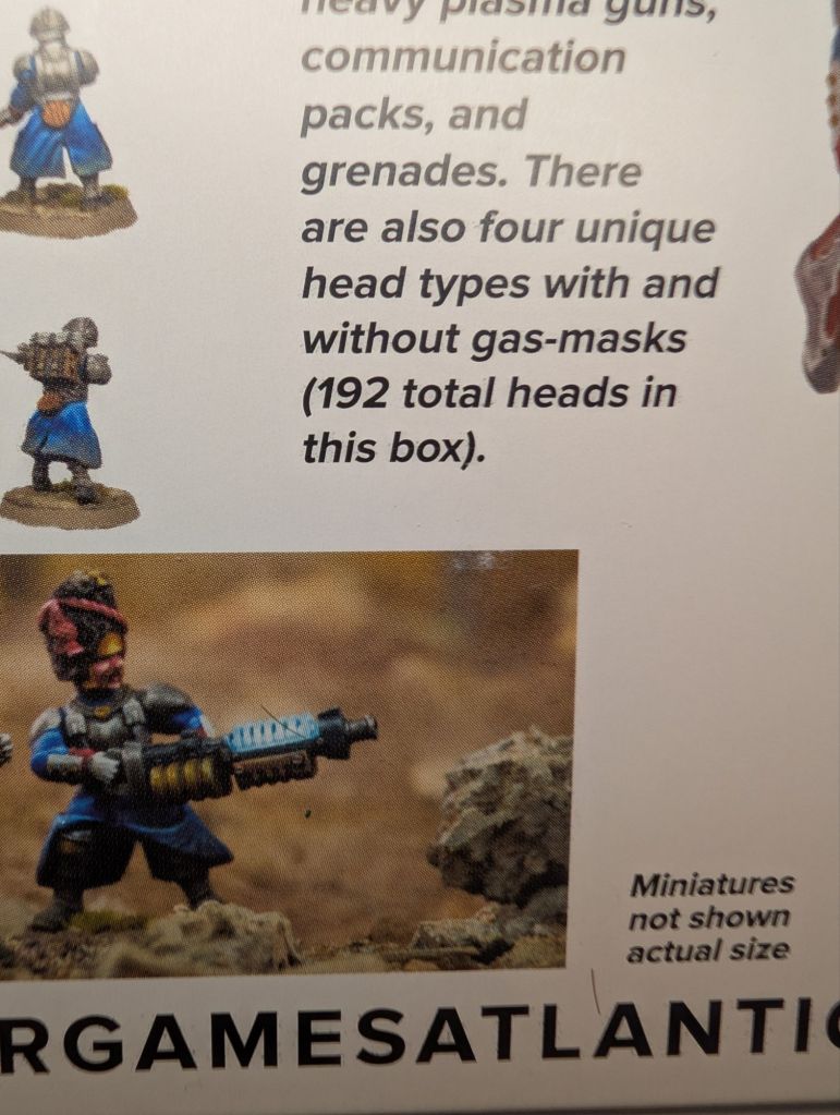Customization: These models are absurdly customizable in terms of their heads. There are 192 weapons with 4 hat types that either have gasmasks or do not have gas masks, so really there are 8 head types and multiples of each. So if you want all your models to have gasmasks and helmets, then you can. You want your entire army to have a feathery adorned hat without a mask? You can do that too. You want them to have a little of everything? Then by all means do that, they’ll still look like they’re on the same team and like they have different roles. The head types can also be used to distinguish different weapons on the field so you don’t have to keep track of which model has the flamethrower, just remember your flamethrower guys are the ones with the bearskins (those are the hats the royal guard wears that look like giant poofy balls of fur). The left-handed weapons variety is limited however, so if you want to be realistic and have 10% of your army be left handed, they’ll be limited to a grenade.