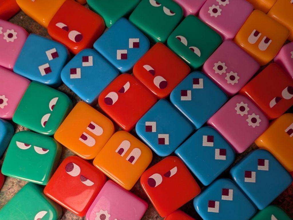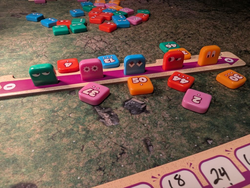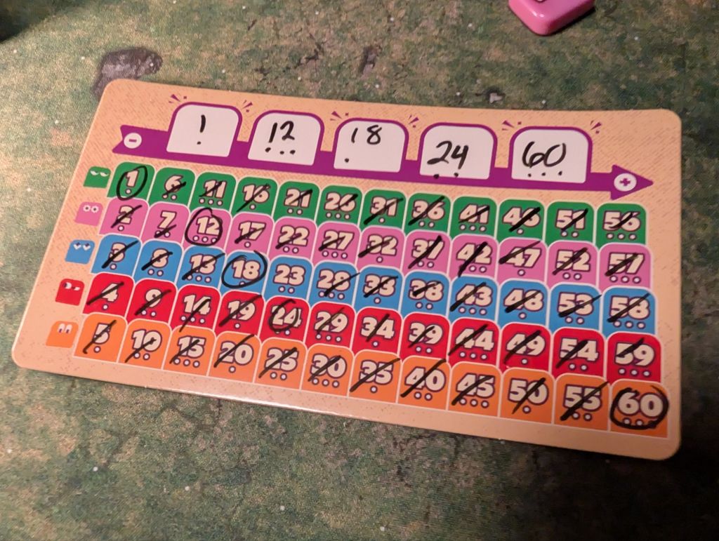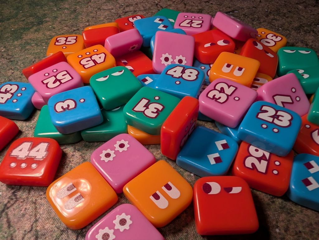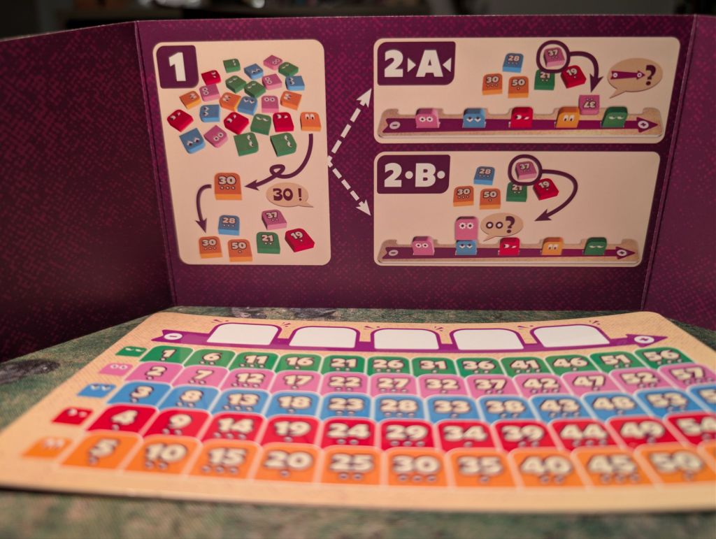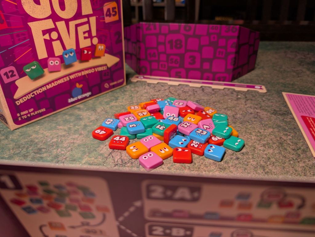 Artwork: Wonderful. The colors pop and the game has an almost 70s style aesthetic, particularly with the styling of the cards where you mark the numbers you eliminate. One particular detail we love is the little faces on the number squares, giving them personality. Especially as you can’t see the five numbers you are trying to guess but you can see their sassy little faces staring back at you.