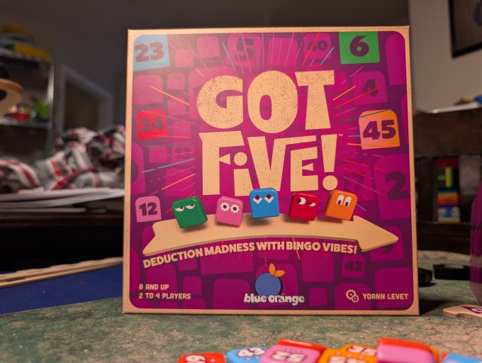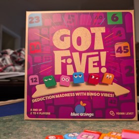 Got Five! is the ultimate deduction game. Each colorful square tile has a number on one side of it. Each player has five tiles, the numbers hidden from their view but the colors visible. However, other players can always see opponents numbers. You are trying to guess what five numbers you have in front of you to win the game, but you only get one guess!