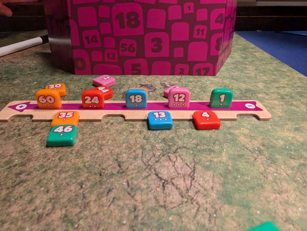 In order to deduce what numbers you have, each player is given a card with all the numbers to mark off as they are eliminated. Throughout the game, a new tile is revealed on each player’s turn, giving one more clue as to what numbers aren’t on your board. The active player then asks their neighbor to Categorize or Compare one of the revealed tiles against their five mystery tiles.