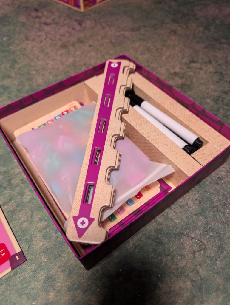Storage: Good! Markers and boards/privacy screens have their own slots and the tiles have a bag. The support panels you use for your five hidden tiles have to go on top sideways but they don’t make closing the box difficult.